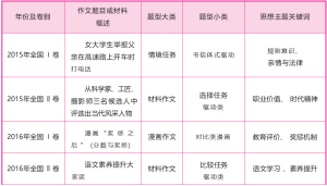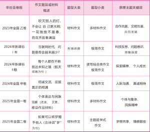 即便如此, 对2015一2025年高考作文题目进行系统梳理, 明确题目类型、 核心主题和写作注意事项, 依然会为未来提供镜鉴。